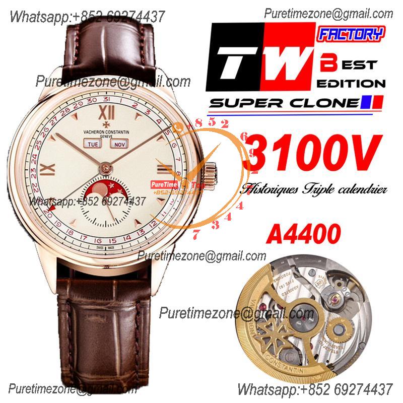 Historiques Triple Calendrier 3100V A4400 Automatic Mens Watch Best Edition Moon Phase TWF 40 RG White Dial Leahter CHS