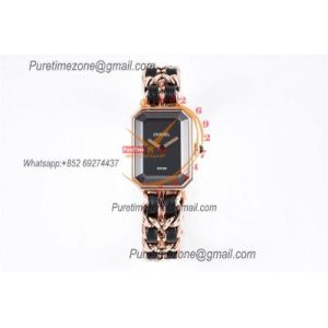 Premiere H0451 Swiss Quartz Womens Watch Best Edition BVF Rose Gold Black Dial Interwoven Leahter Strap Ladies