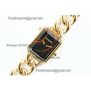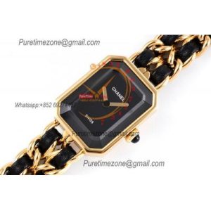 Premiere H0451 Swiss Quartz Womens Watch Best Edition BVF Yellow Gold Black Dial Interwoven Leahter Strap Ladies