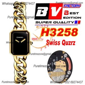 Premiere H3256 Swiss Quartz Womens Watch Best Edition BVF Yellow Gold Black Dial SS Bracelet Ladies