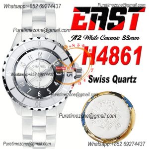 J12 H4861 33mm Swiss Quartz Womens Watch Best Edition EAST White Korea Ceramic Gray Dial on Bracelet