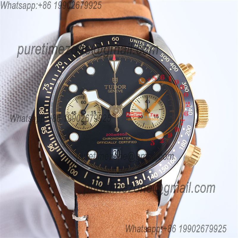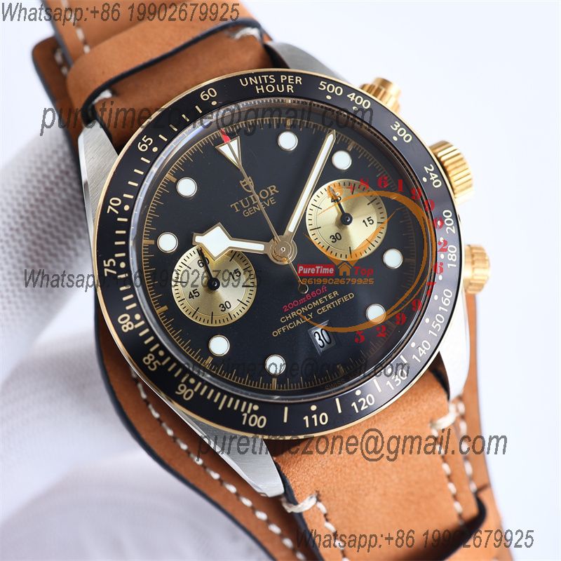 M79363N BLACK BAY CHRONO Automatic Chronograph Mens Watch TWF Two Tone Gold Black Dial Brown Leather Strap Super Clone