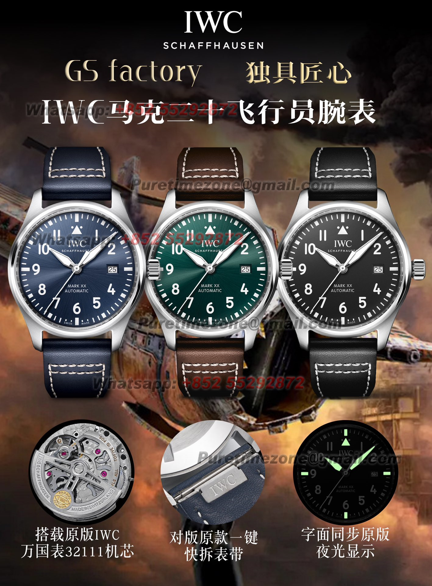 Movement:Custom Designed Slim Asian automatic movement (Same thickness as original IWC 82200 Calibre Movement)
