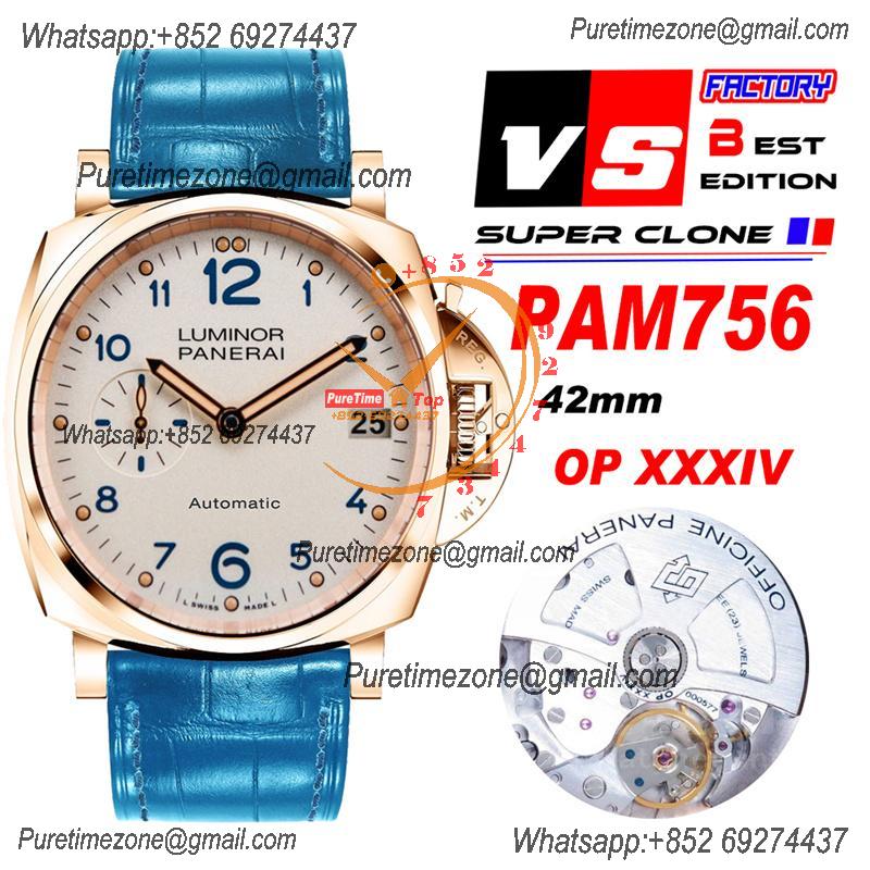 Home Panerai Luminor PAM00756 Luminor Due OP AXXXIV Automatic Mens Watch VSF 42mm Best Edition White Dial on Blue Leather Strap