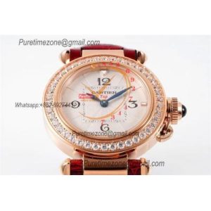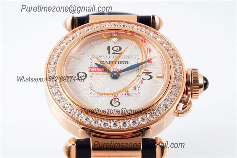 Pasha WJPA0017 Swiss Quartz Womens Watch Best Edition AF 30mm RG Diamonds Bezel White Textured Dial Red Leather