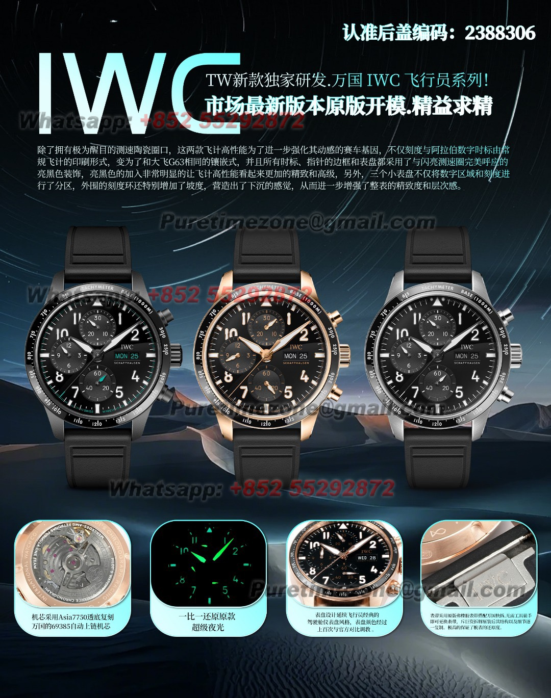 Decoration: Platinum plated movement plate and rotor which are made according to the genuine movement, the best looking IWC 69385 Movement Clone at the moment.