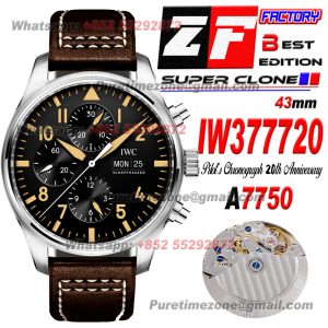 Pilot Chronograph IW377720 Automatic Mens Watch Super Clone ZF 43mm Black Dial Brown Leather Strap A7750 $630.00 $530.00