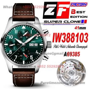 Pilot's Chronograph IW388103 Automatic Mens Watch Super Clone ZF 41 Green Dial Brown Leather Strap A69385 $650.00 $550.00