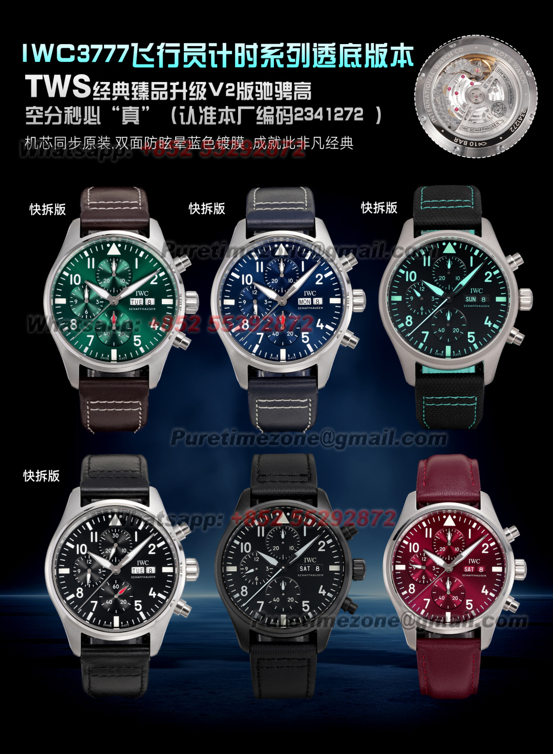 Decoration: Platinum plated movement plate and rotor which are made according to the genuine movement, the best looking IWC 69385 Movement Clone at the moment.