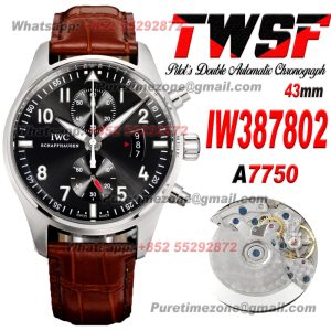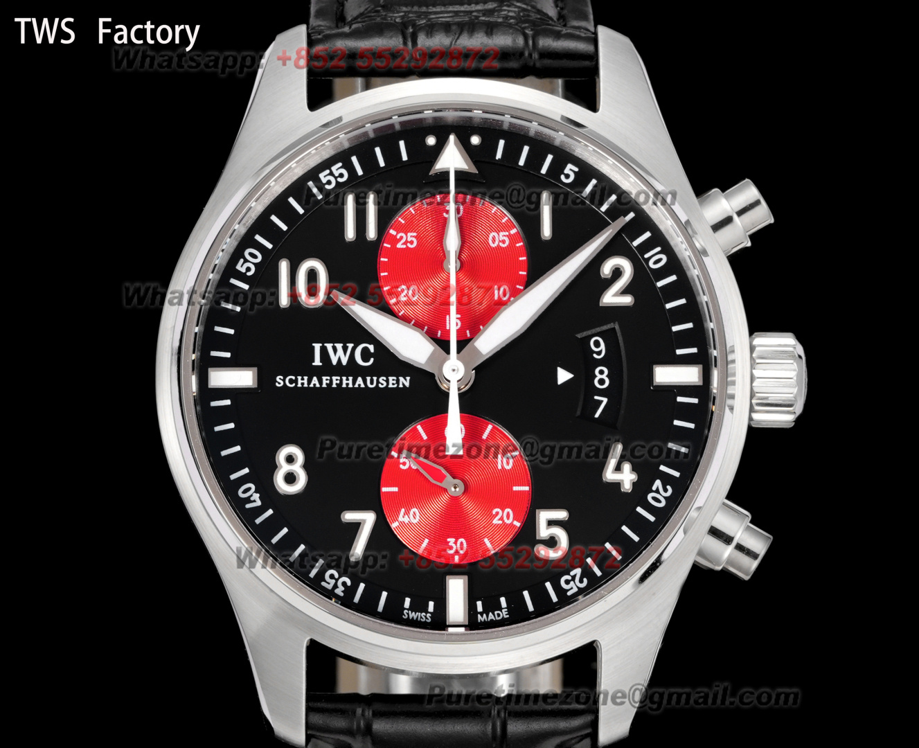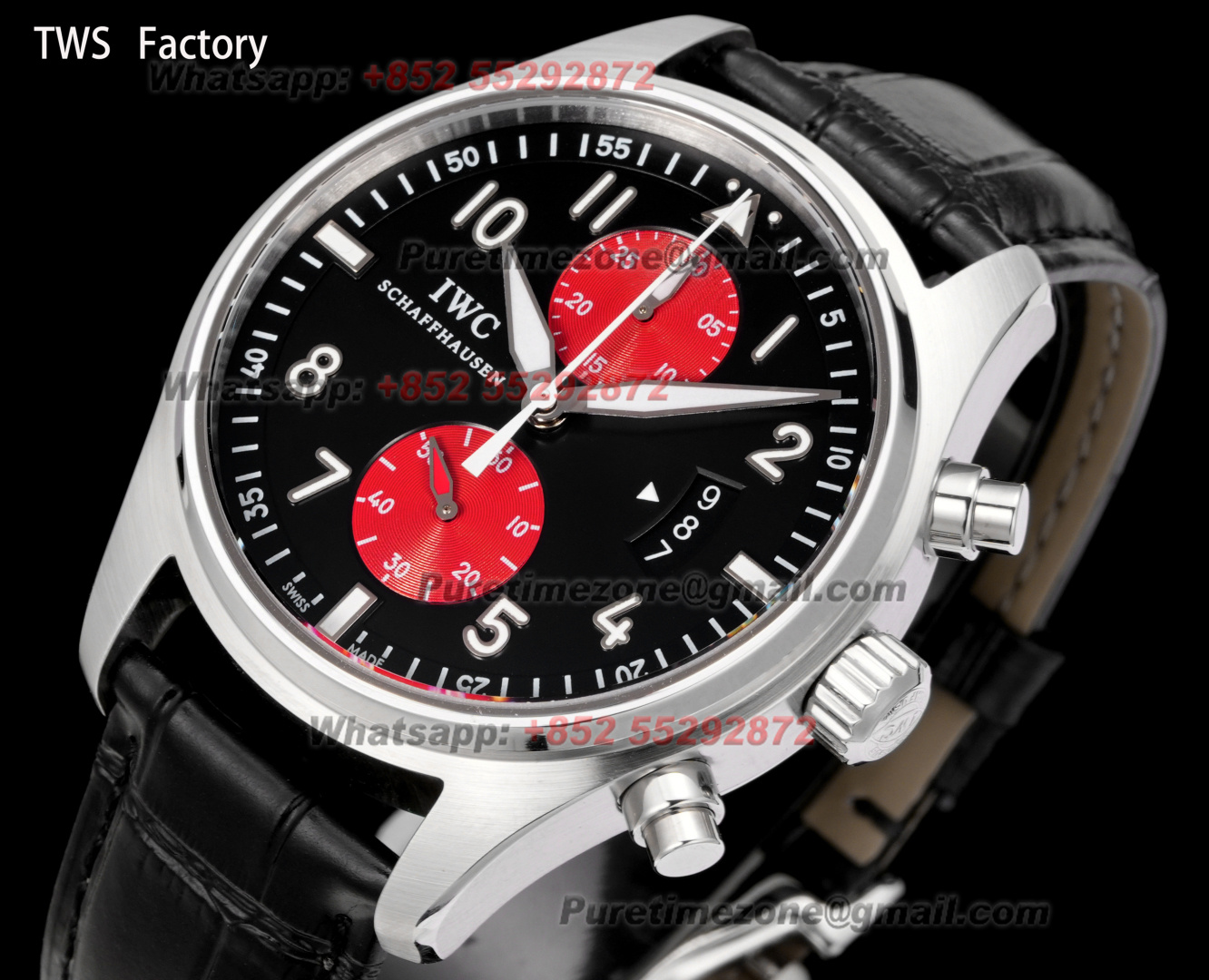 Pilot’s Spitfire Chronograph IW387802 Automatic Mens Watch Super Clone 43 Black Red Dial Leather Strap A7750
