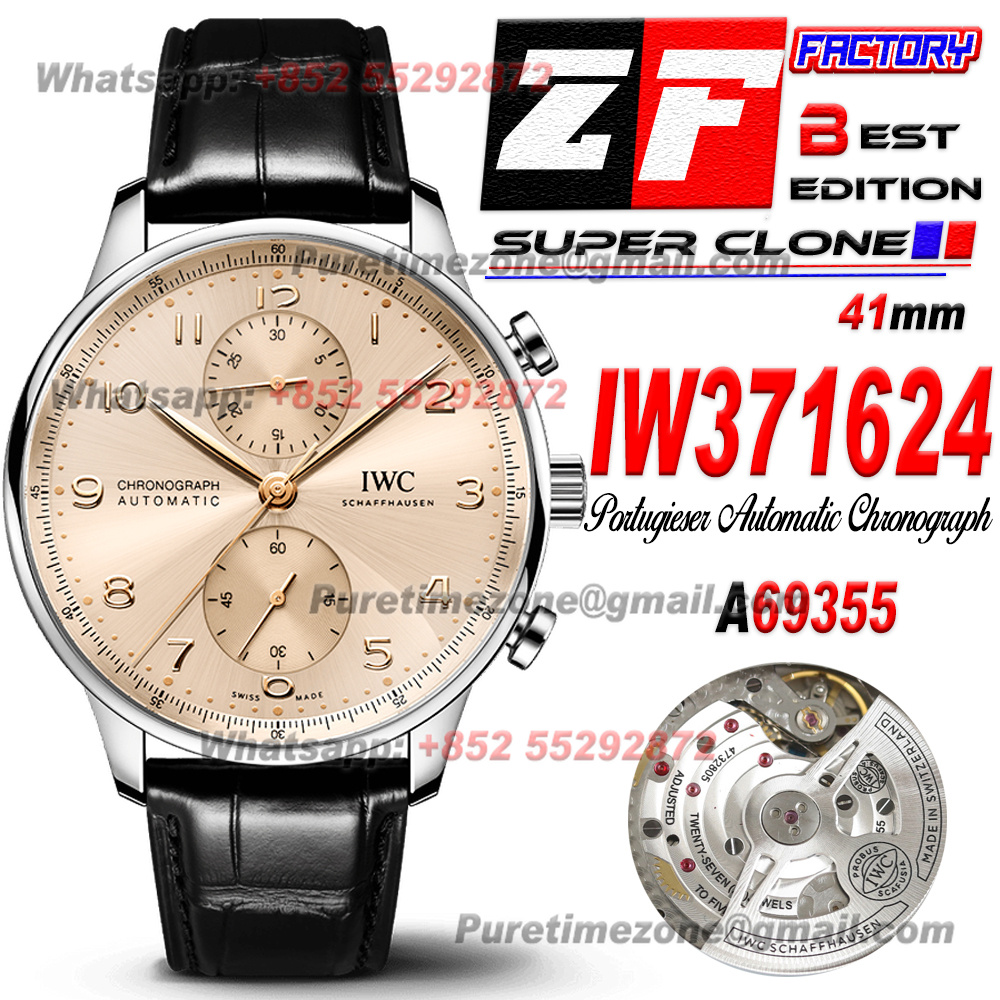 Portugieser Chronograph IW371624 Automatic Mens Watch Super Clone ZF Beige Dial Black Leather Strap A96355