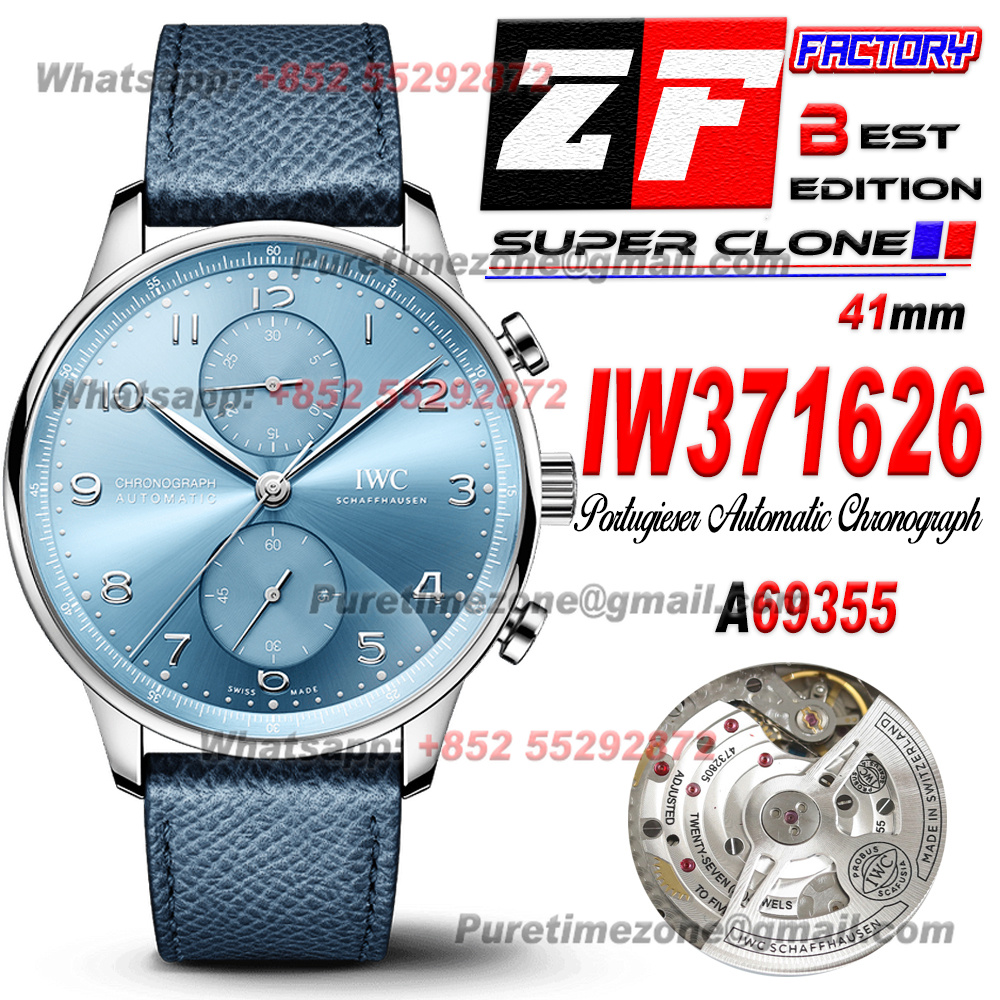 Portugieser Chronograph IW371626 Automatic Mens Watch Super Clone ZF ICE Blue Dial Blue Leather Strap A96355