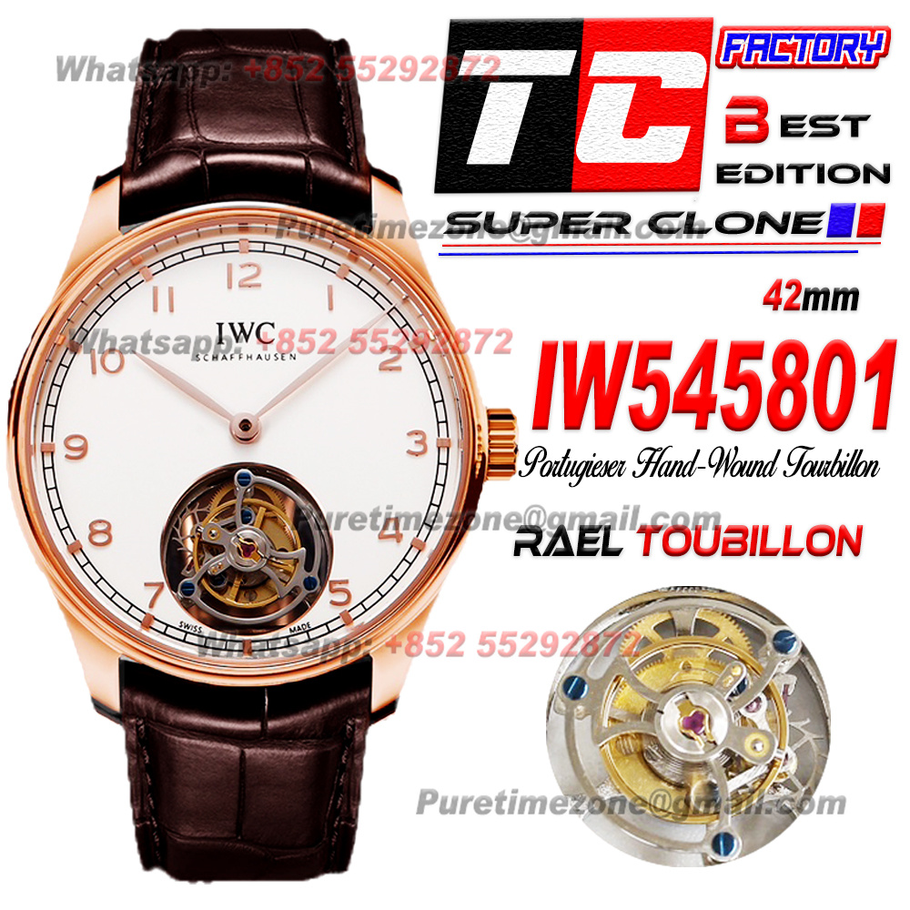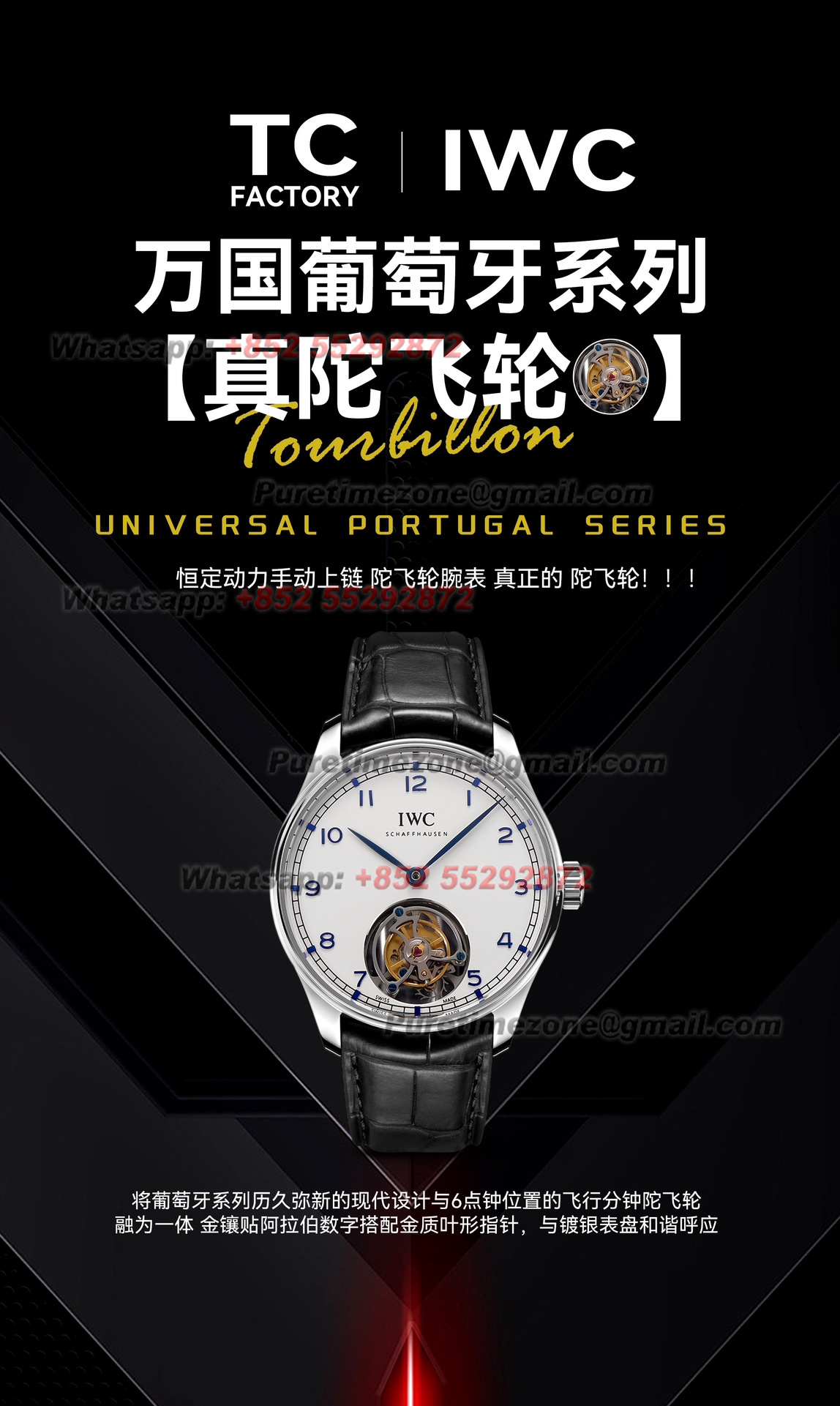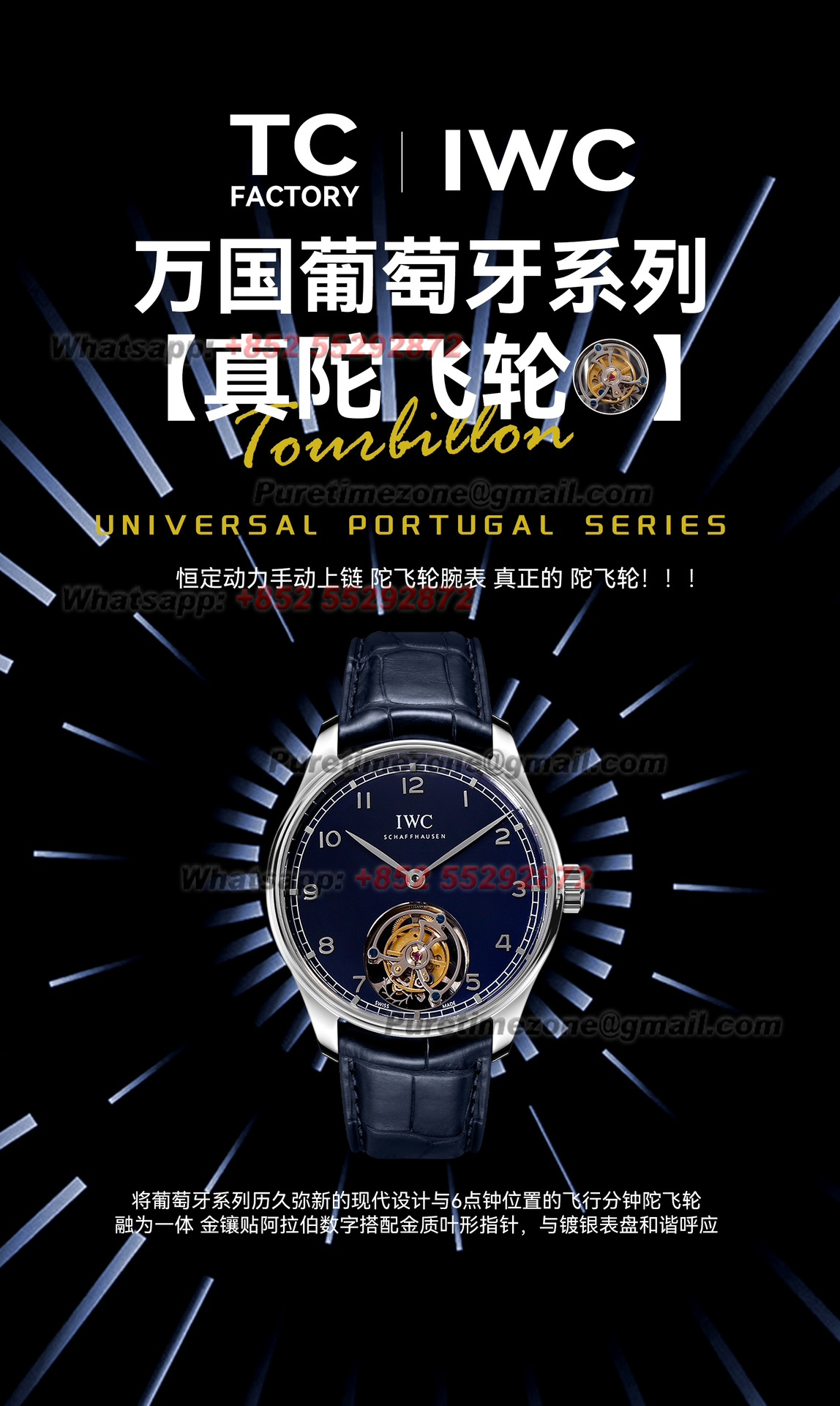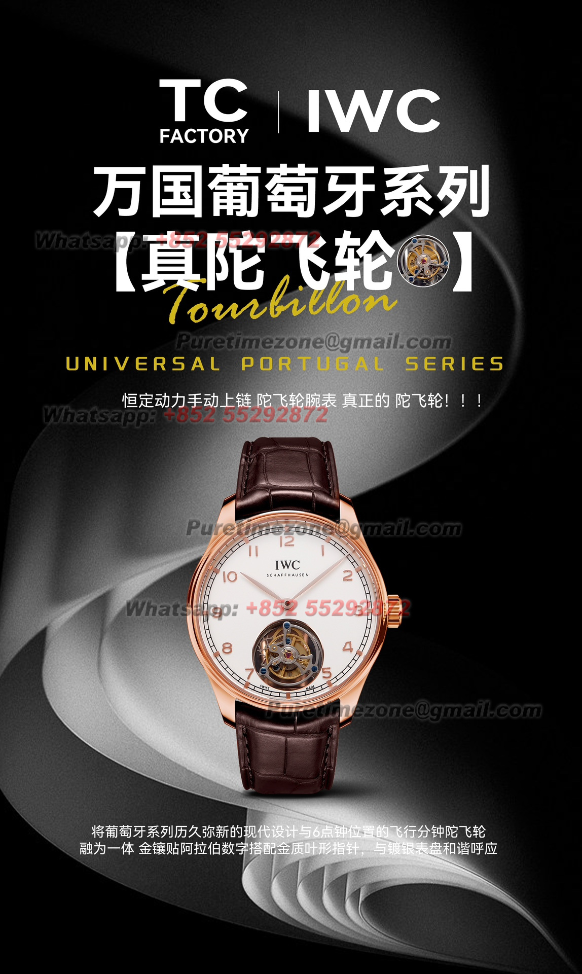 Movement:Asian hand winding tourbillon movement Clone IWC 81905 movement,Power reserve up to 72 hours.