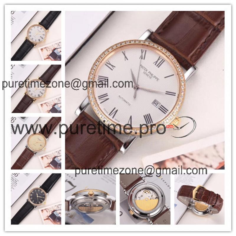 Replica Calatrava A21j Automatic Movement Mens Watch White Dial Diamonds Case Leather Strap A E10
