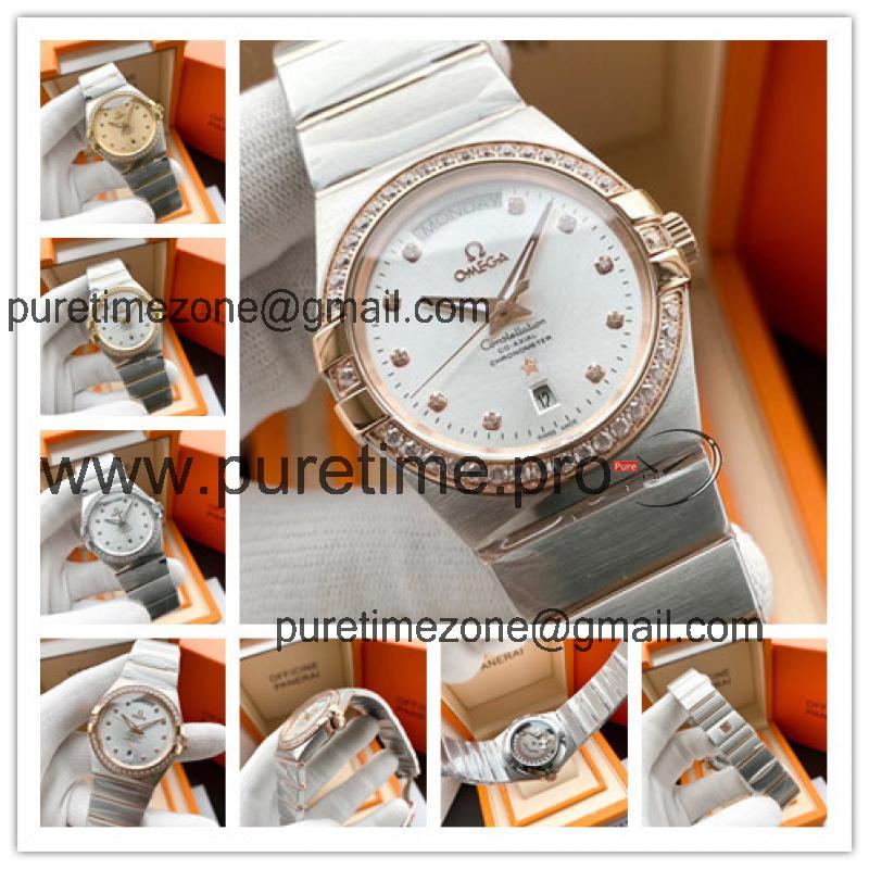 Replica Constellation A21j Automatic Movement Mens Watch Silver Dial Diamonds Case Two Tone Rose Gold B E373