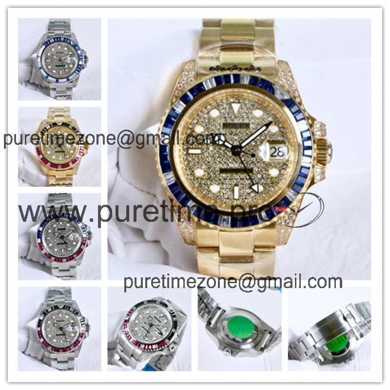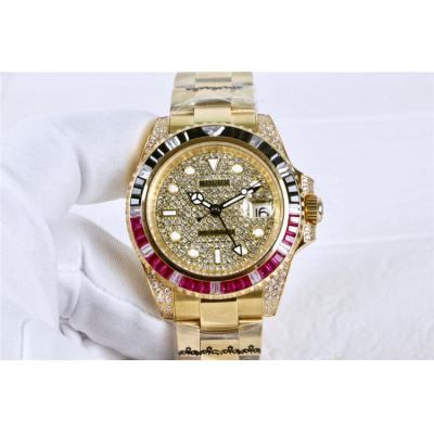 Replica GMT-MASTER A21J Automatic Movement Mens Watch Full Diamonds Dial Oyster Bracelet Yellow Gold E40
