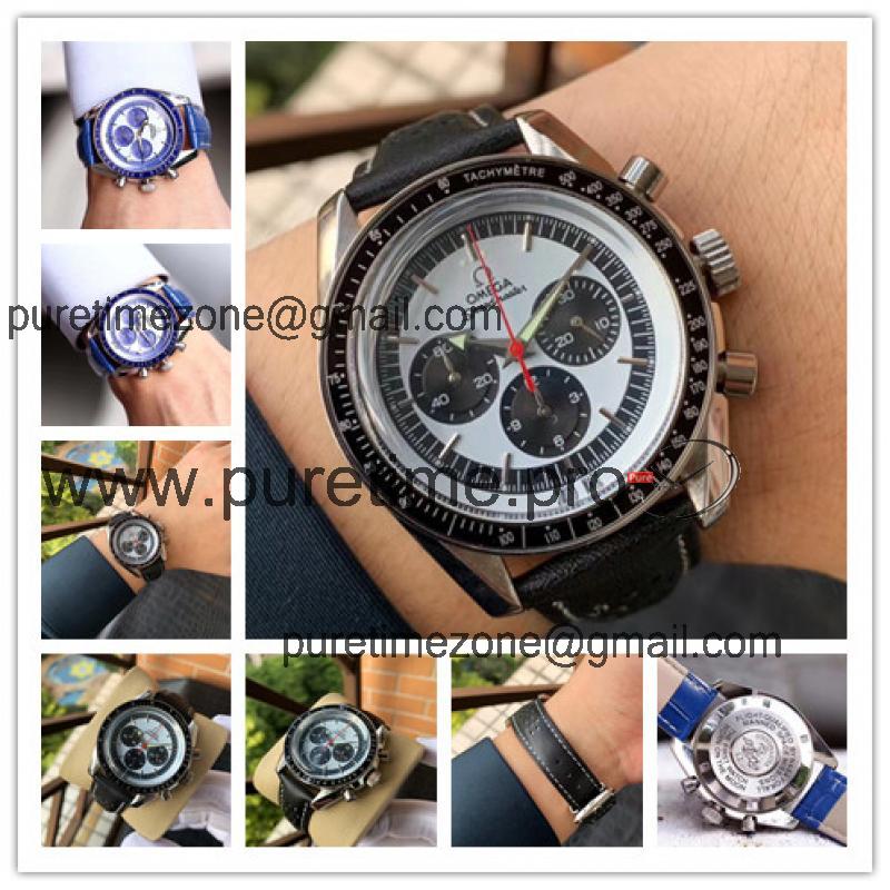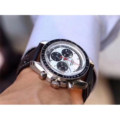 Replica Speedmaster Japan OS Quartz Chronograph Movement Mens Watch White Black Dial Leather Strap E403