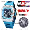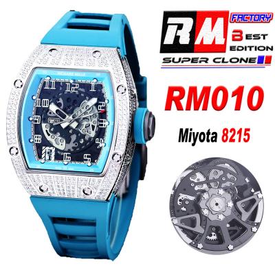 Home Richard Mille RM010 Miyota Automatic Mens Watch RMF Diamonds Case Skeleton Dial Blue Rubber Strap CHS