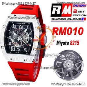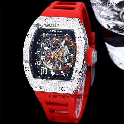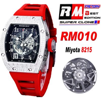 Home Richard Mille RM010 Miyota Automatic Mens Watch RMF Diamonds Case Skeleton Dial Red Rubber Strap CHS