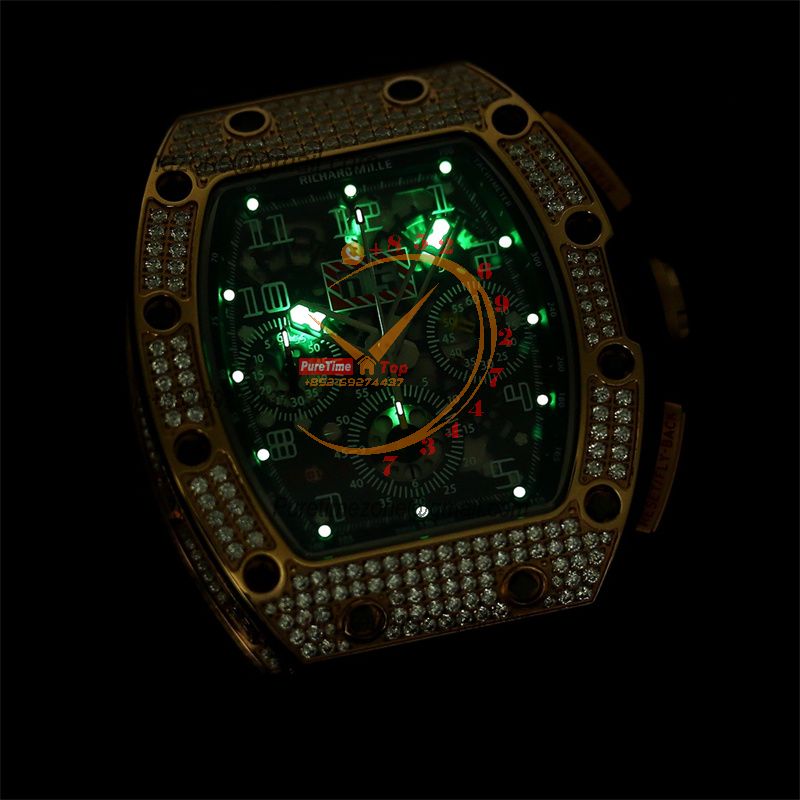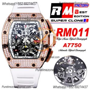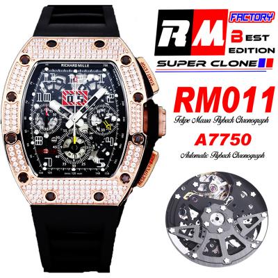 Home Richard Mille RM011 Felipe Massa A7750 Automatic Chronograph Mens Watch RMF Best Edition RG Diamonds Bezel Black Dial Rubber Strap CHS
