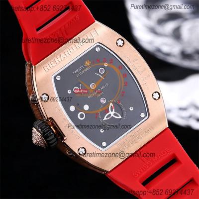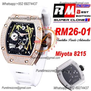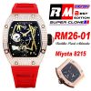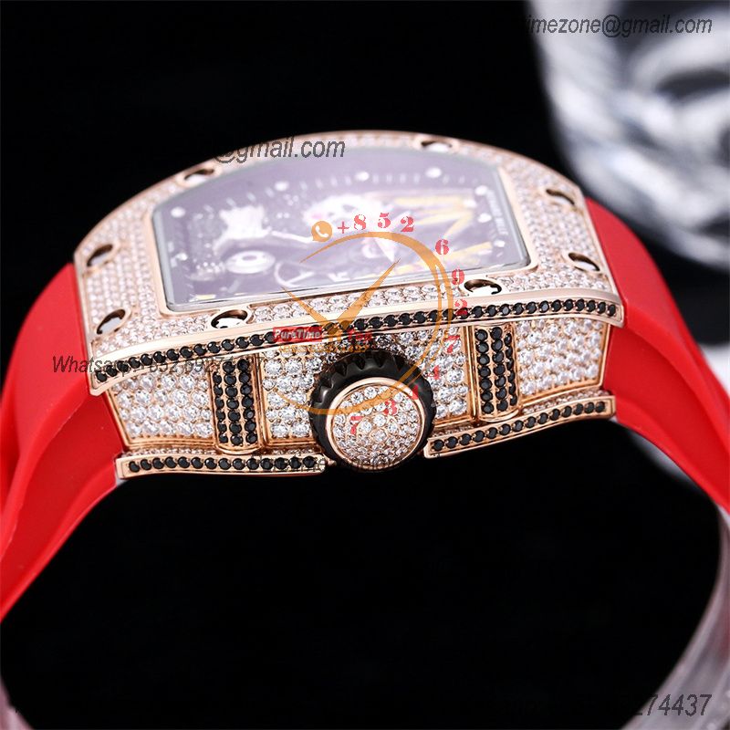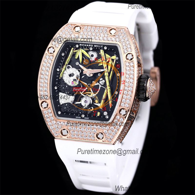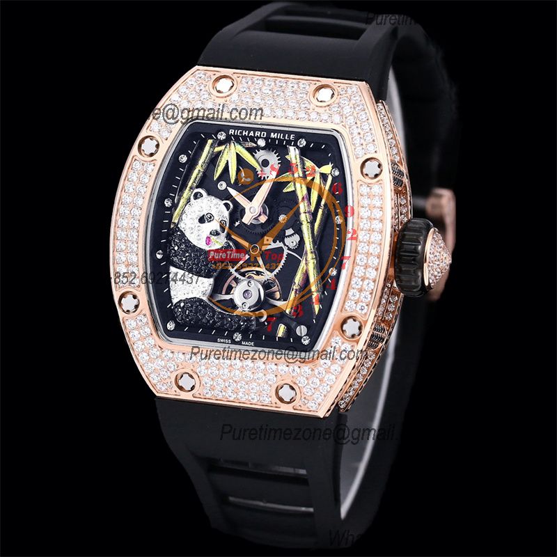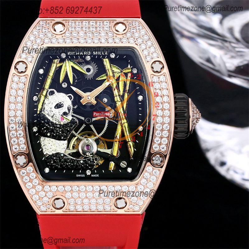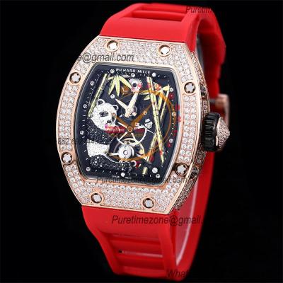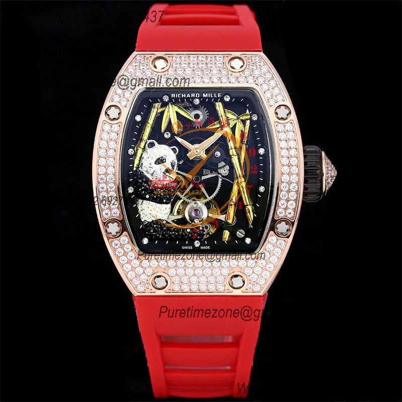 RM026-01 Tourbillon Panda M8215 Automatic Mens Watch RMF RG Diamonds Bezel Skeleton Dial Red Rubber Strap CHS