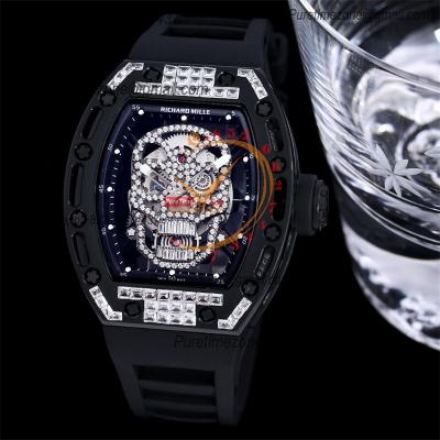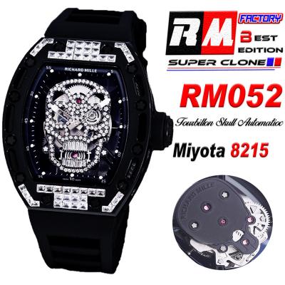 Home Richard Mille RM052 Polished Miyota 8215 Automatic Mens Watch RMF DLC Full Paved Diamonds Skull Dial Black Rubber CHS