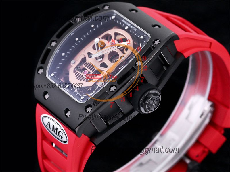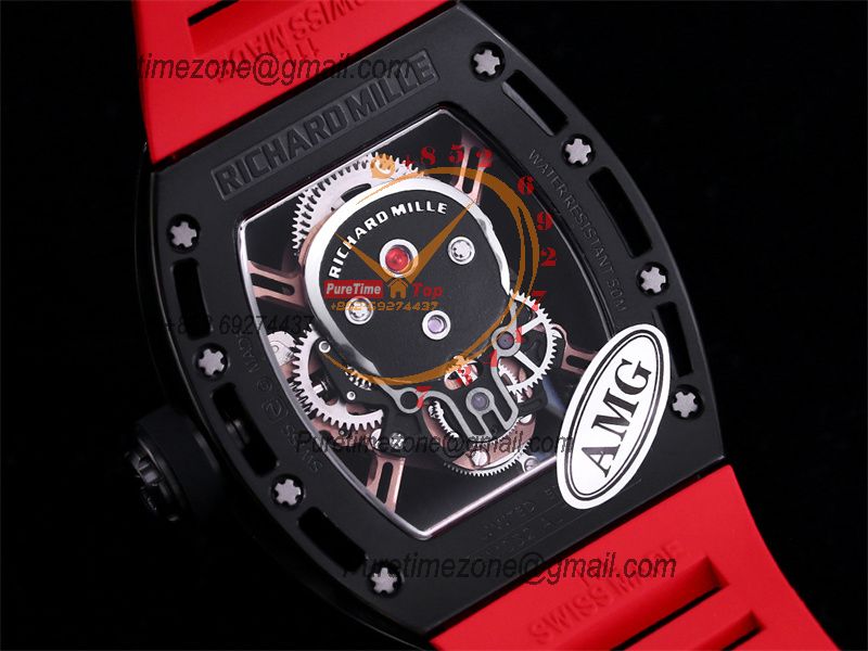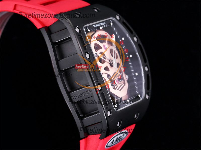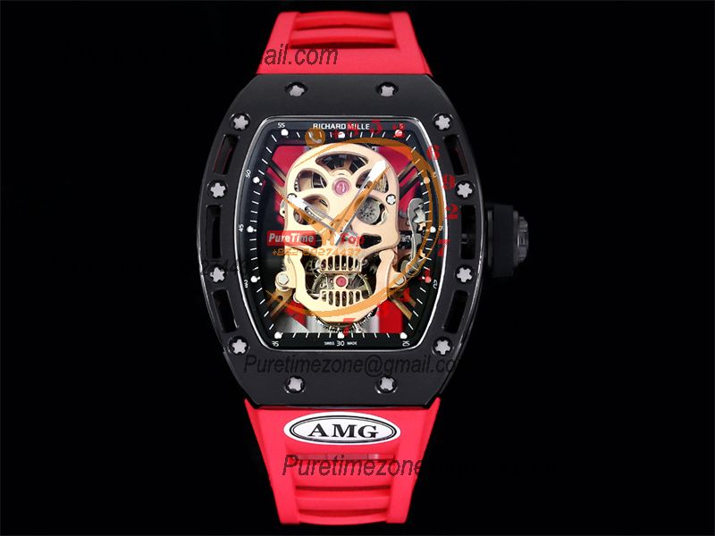 RM052 Real Tourbillon Hand Winding Mens Watch Best Edition AMGF DLC All Black Gold Skull Dial Red Rubber Strap CHS