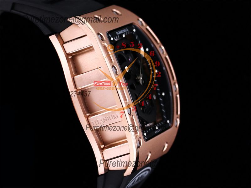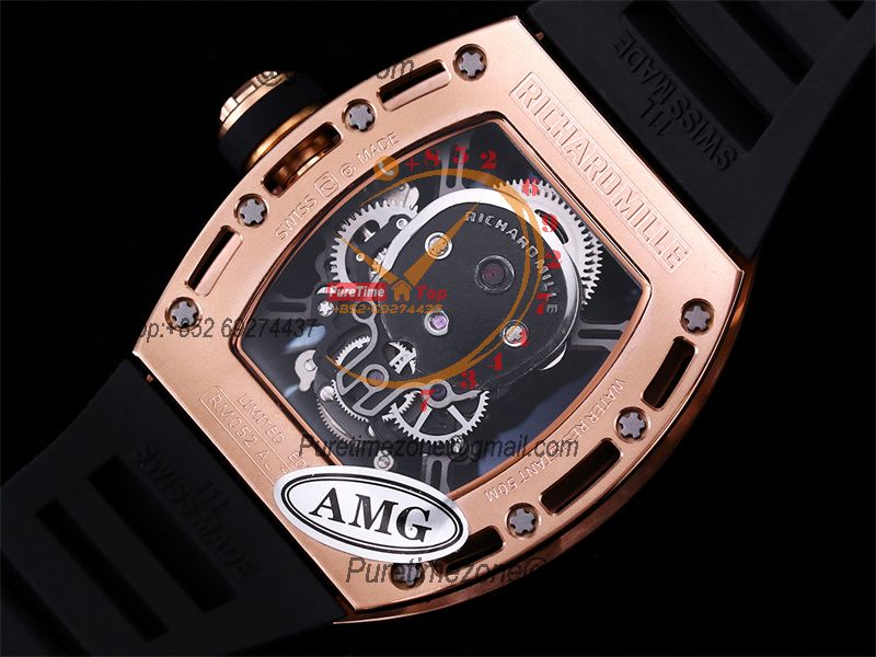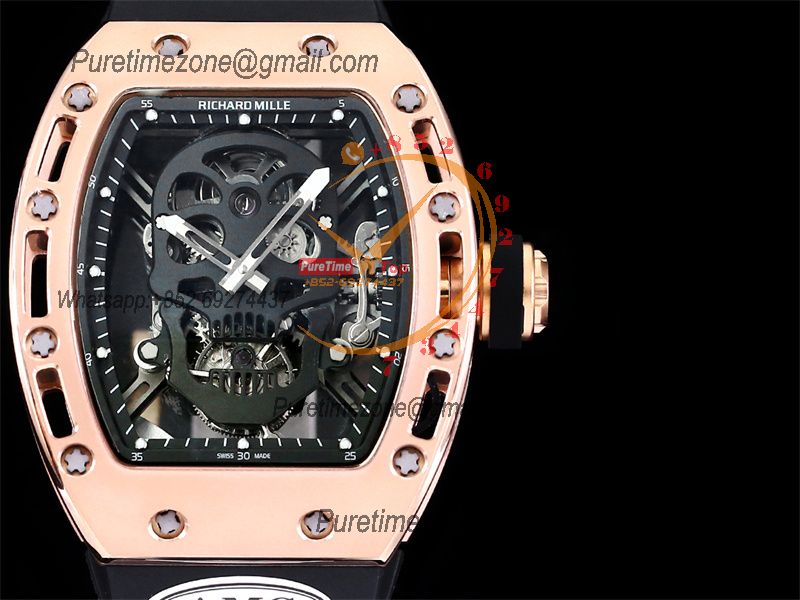 Home Richard Mille RM052 Real Tourbillon Hand Winding Mens Watch Best Edition AMGF RG Black Skull Dial Black Rubber Strap CHS