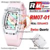 RM07-01 Swiss Quartz Womens Watch RMF White Ceramic Diamond Bezel Marshmallow Dial Pink Rubber Ladies