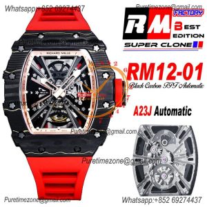 RM12-01 José Balvin Automatic Tourbillon Mens Watch RMF Black Carbon Fiber Skeleton Dial Red Rubber Strap CHS AAA $600.00 $400.00