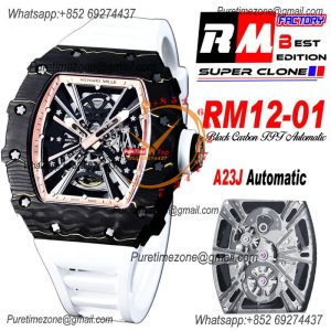 RM12-01 José Balvin Automatic Tourbillon Mens Watch RMF Black Carbon Fiber Skeleton Dial White Rubber Strap CHS AAA $600.00 $400.00