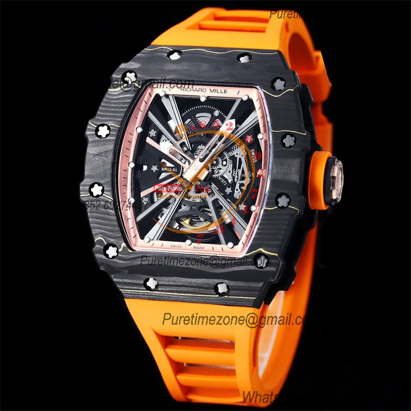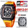 Home Richard Mille RM12-01 José Balvin Automatic Tourbillon Mens Watch RMF Black Carbon Fiber Skeleton Dial Orange Rubber Strap CHS AAA