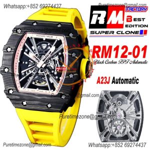 RM12-01 José Balvin Automatic Tourbillon Mens Watch RMF Black Carbon Fiber Skeleton Dial Yellow Rubber Strap CHS AAA $600.00 $400.00
