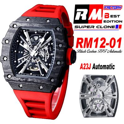 Home Richard Mille RM12-01 José Balvin Automatic Tourbillon Mens Watch RMF Black Carbon Fiber Skeleton Dial Red Rubber Strap CHS AAA