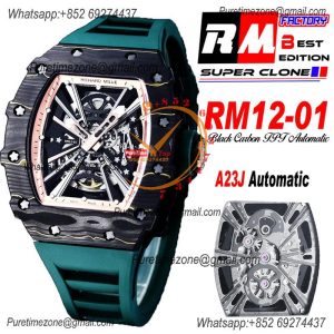 RM12-01 José Balvin Automatic Tourbillon Mens Watch RMF Black Carbon Fiber Skeleton Dial Green Rubber Strap CHS AAA $600.00 $400.00