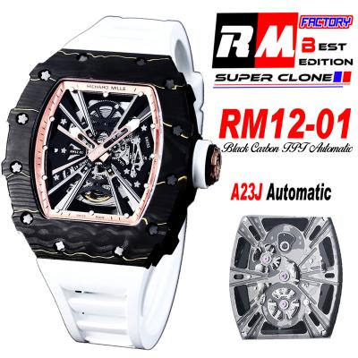 Home Richard Mille RM12-01 José Balvin Automatic Tourbillon Mens Watch RMF Black Carbon Fiber Skeleton Dial White Rubber Strap CHS AAA