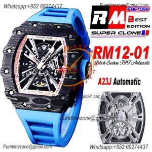 RM12-01 José Balvin Automatic Tourbillon Mens Watch RMF Black Carbon Fiber Skeleton Dial Blue Rubber Strap CHS AAA $600.00 $400.00