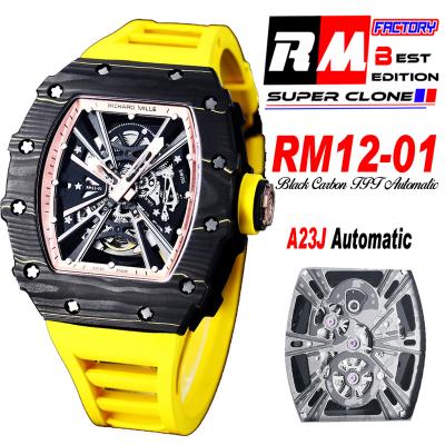 Home Richard Mille RM12-01 José Balvin Automatic Tourbillon Mens Watch RMF Black Carbon Fiber Skeleton Dial Yellow Rubber Strap CHS AAA