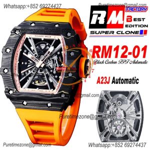 RM12-01 José Balvin Automatic Tourbillon Mens Watch RMF Black Carbon Fiber Skeleton Dial Orange Rubber Strap CHS AAA $600.00 $400.00