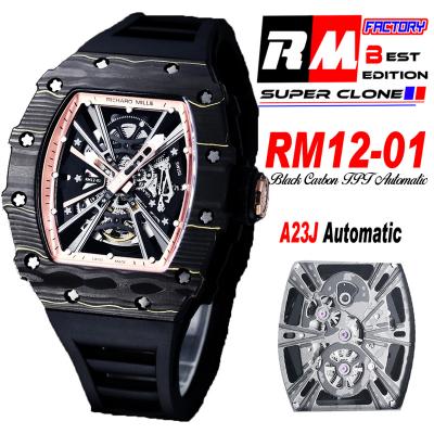 Home Richard Mille RM12-01 José Balvin Automatic Tourbillon Mens Watch RMF Carbon Fiber Skeleton Dial All Black Rubber Strap CHS AAA