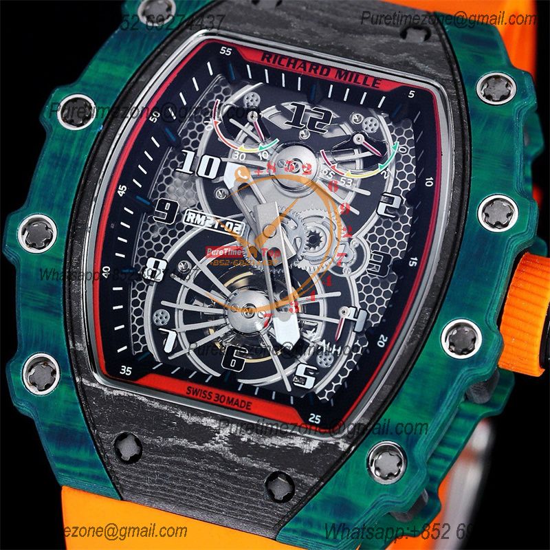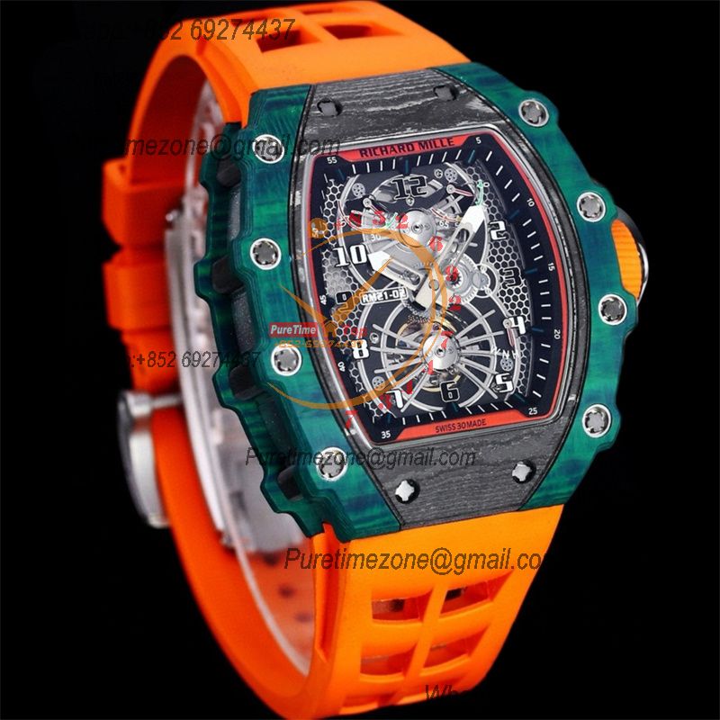 Home Richard Mille RM21-01 Tourbillon Automatic Mens Watch RMF Blue Carbon Fiber Black Dial Orange Rubber Strap CHS
