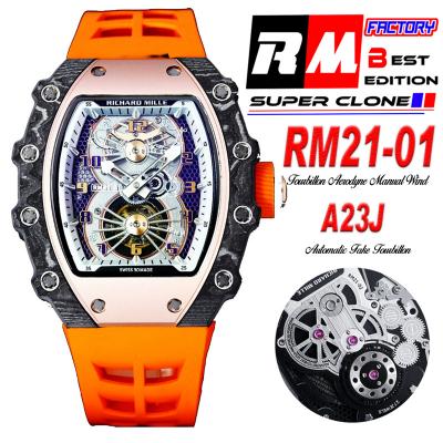 Home Richard Mille RM21-01 Tourbillon Automatic Mens Watch RMF Blue Carbon Fiber Black Dial Orange Rubber Strap CHS