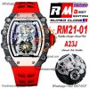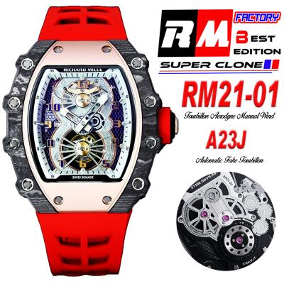Home Richard Mille RM21-01 Tourbillon Automatic Mens Watch RMF Carbon Fiber RG Black Dial Red Rubber Strap CHS