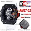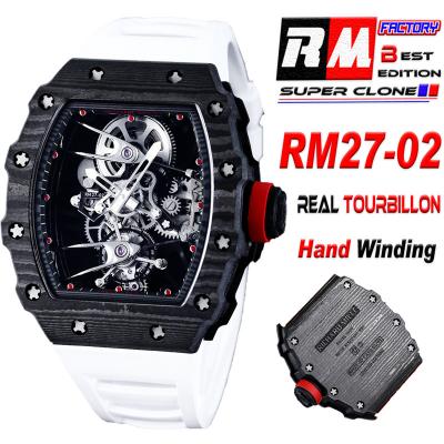 RM27-02 Real Tourbillon Hand Winding Mens Watch Best Edition RMF Carbon Case Skeleton Dial White Rubber Strap CHS