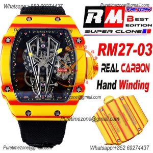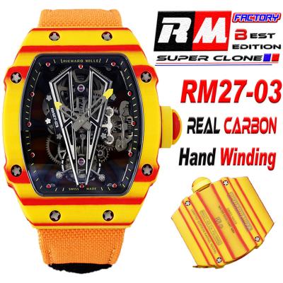 Home Richard Mille RM27-03 NTPT Real Tourbillon Hand Winding Mens Watch Best Edition RMF Yellow Carbon Skeleton Dial Nylon Strap CHS