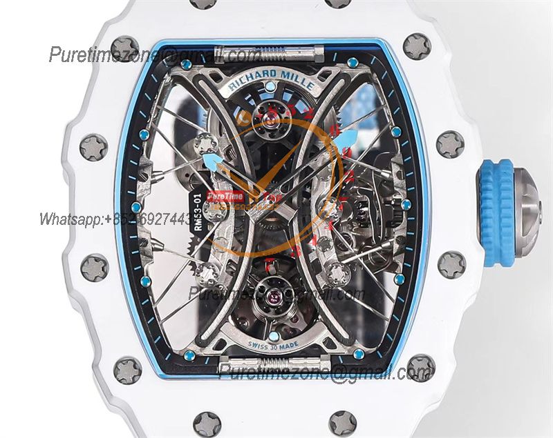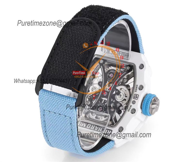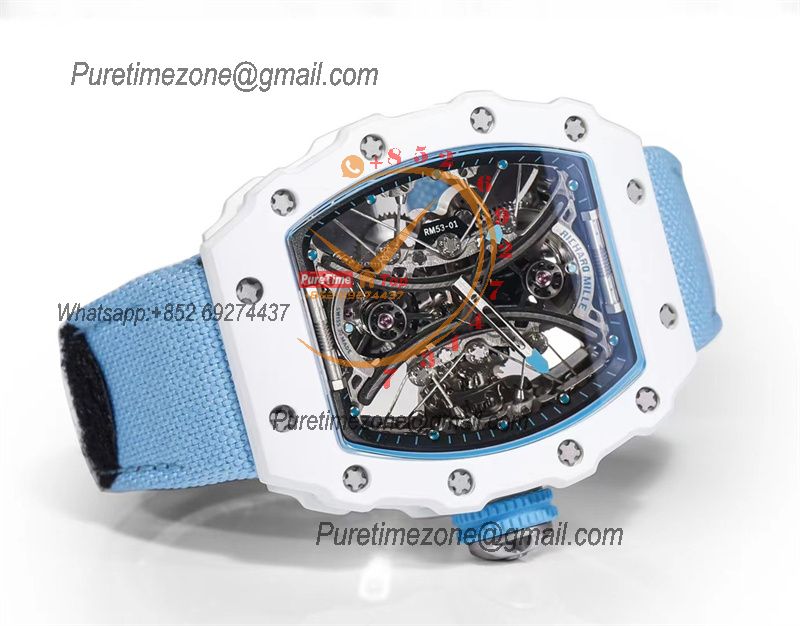 Home Richard Mille RM53-01 Pablo MacDonough Manual Wind Real Tourbillon Mens Watch RMF Best Edition White Carbon Fiber Blue Nylon CHS