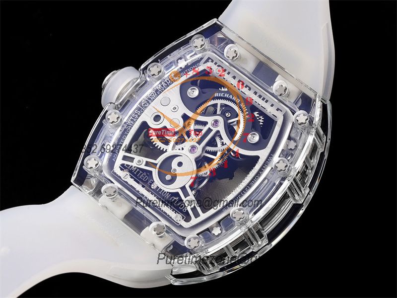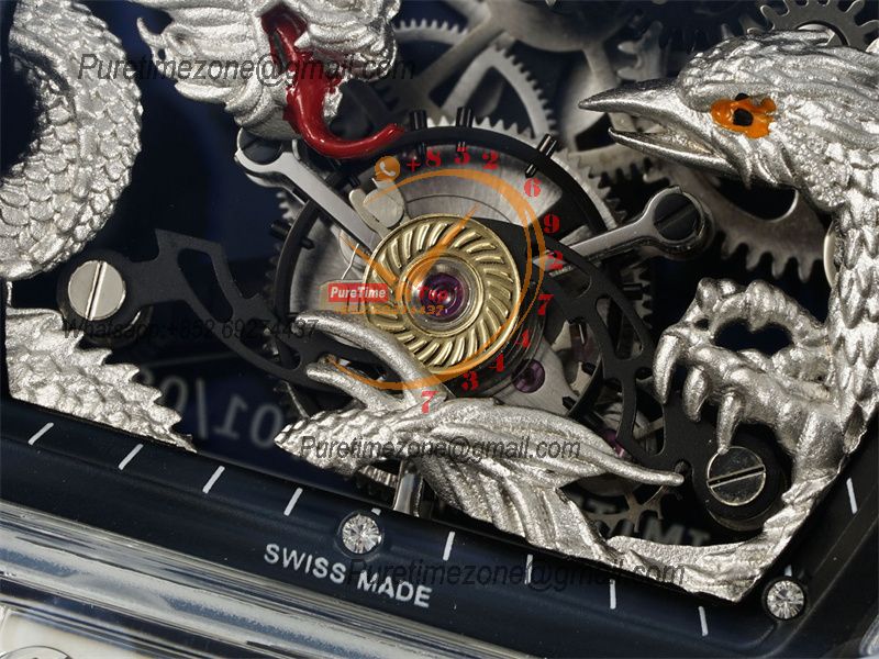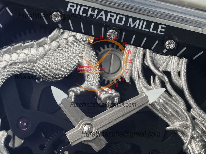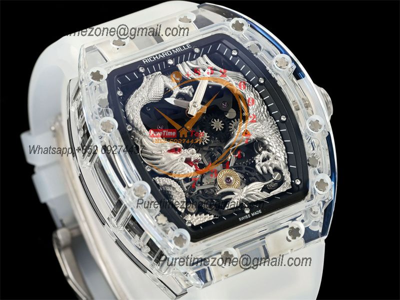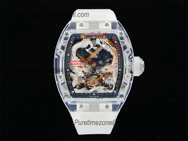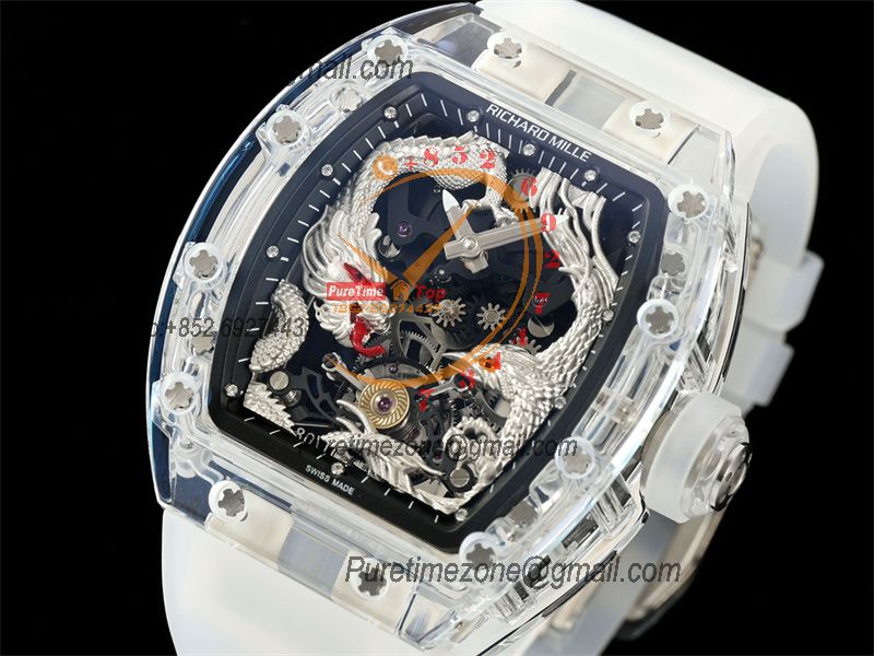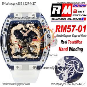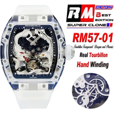 RM57-01 Transparent Real Tourbillon Hand Winding Mens Watch Best Edition RMF Silver Dragon and Phoenix Dial Rubber CHS