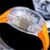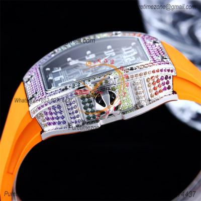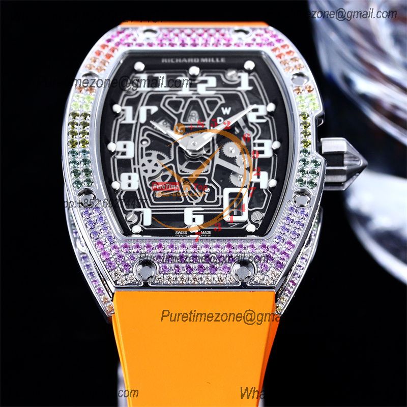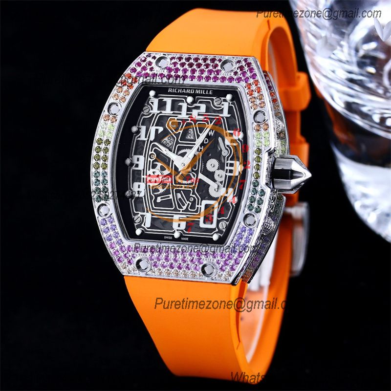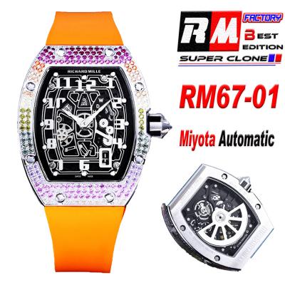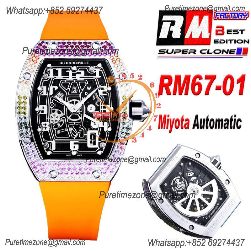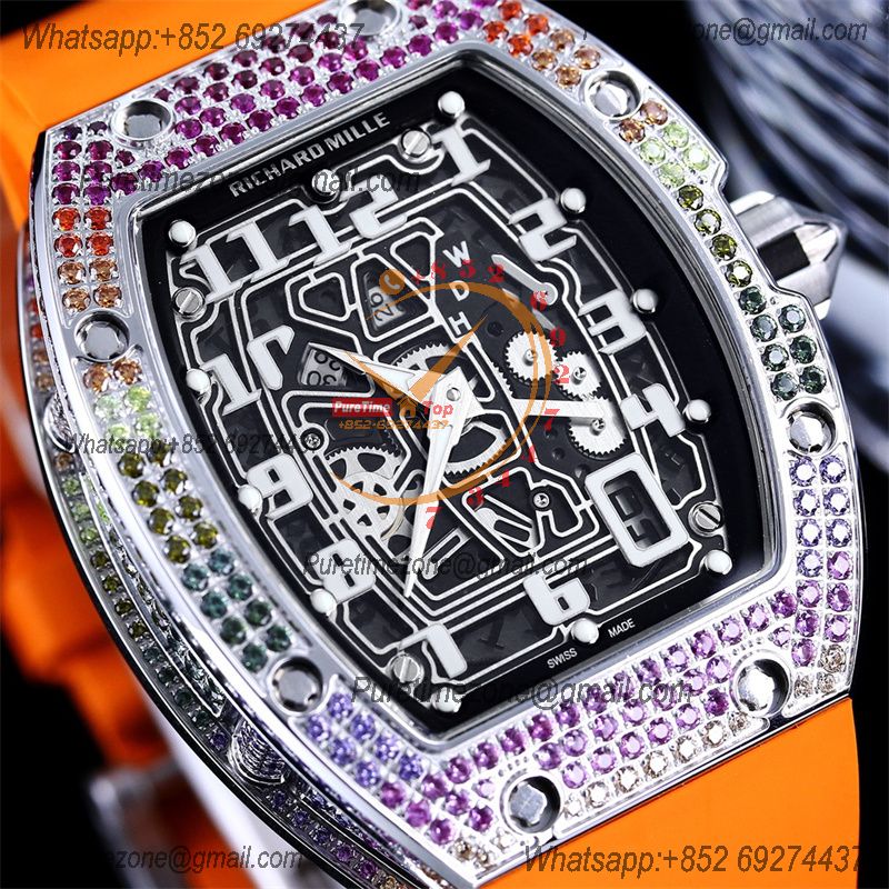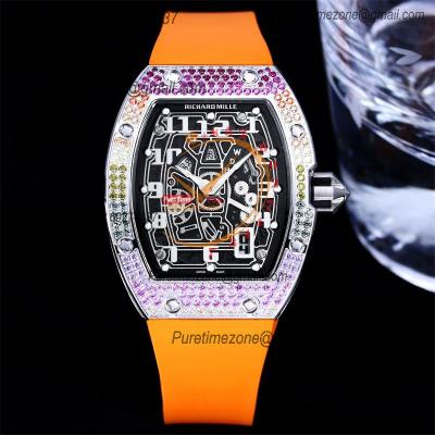Home Richard Mille RM67-01 Miyota Automatic Mens Watch RMF Rainbow Diamond Bezel Skeleton Dial Orange Rubber Strap CHS