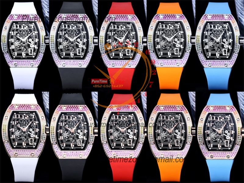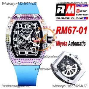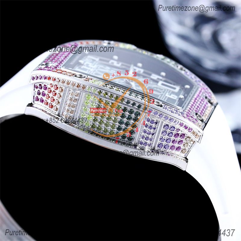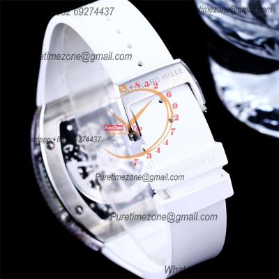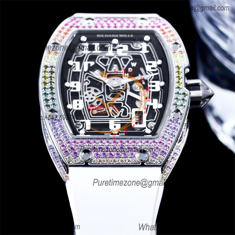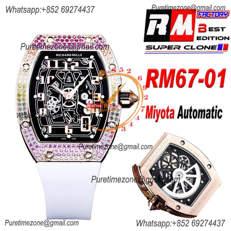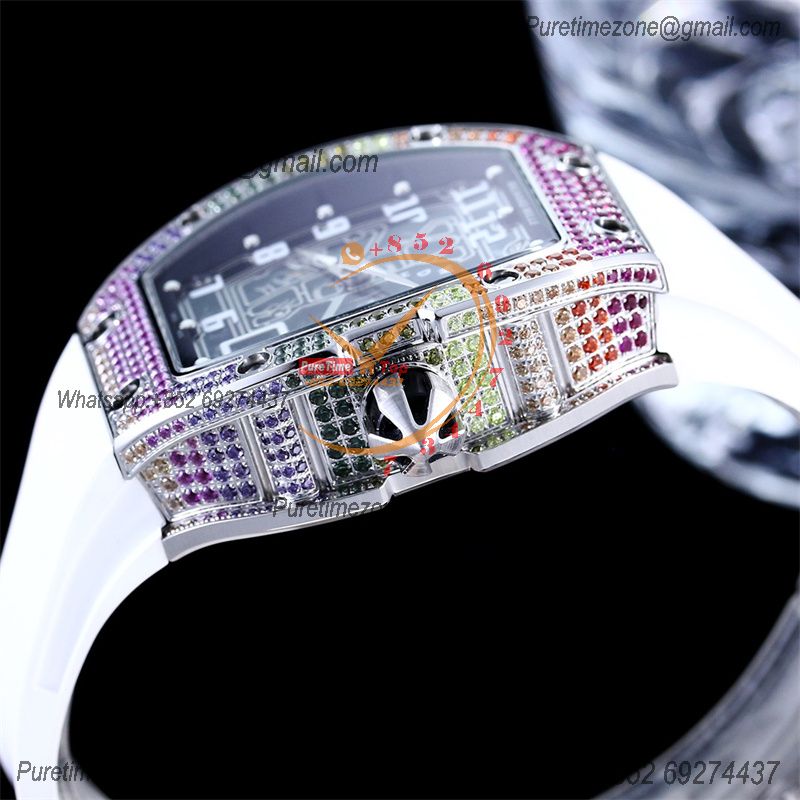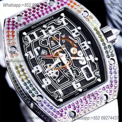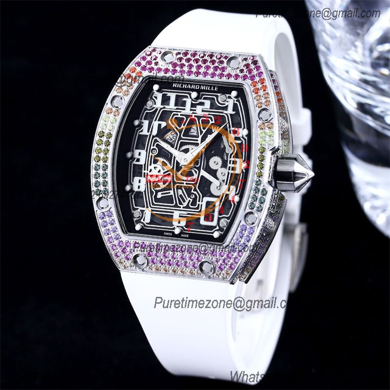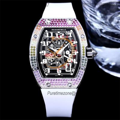 Home Richard Mille RM67-01 Miyota Automatic Mens Watch RMF Rainbow Diamond Bezel Skeleton Dial White Rubber Strap CHS