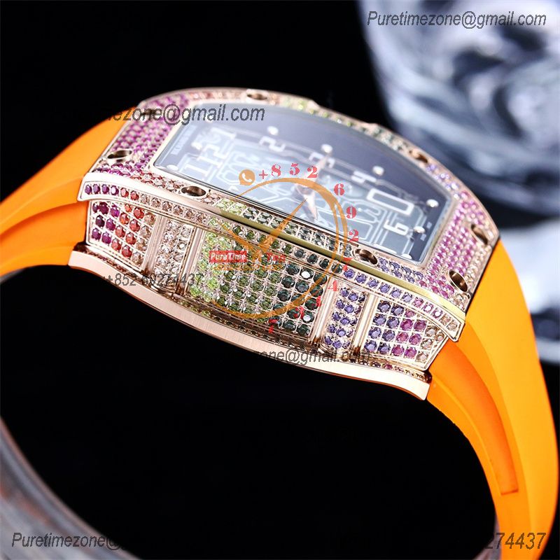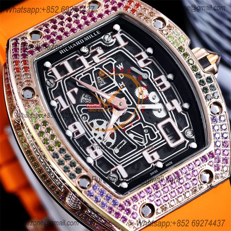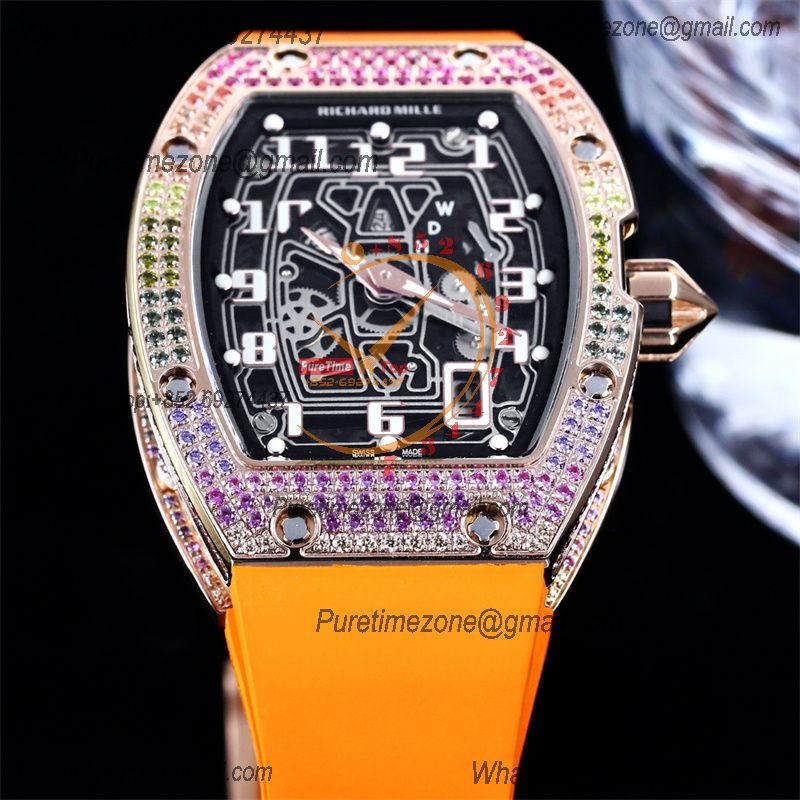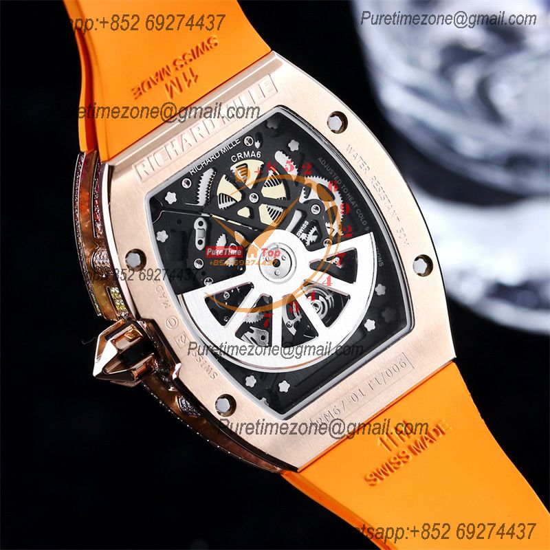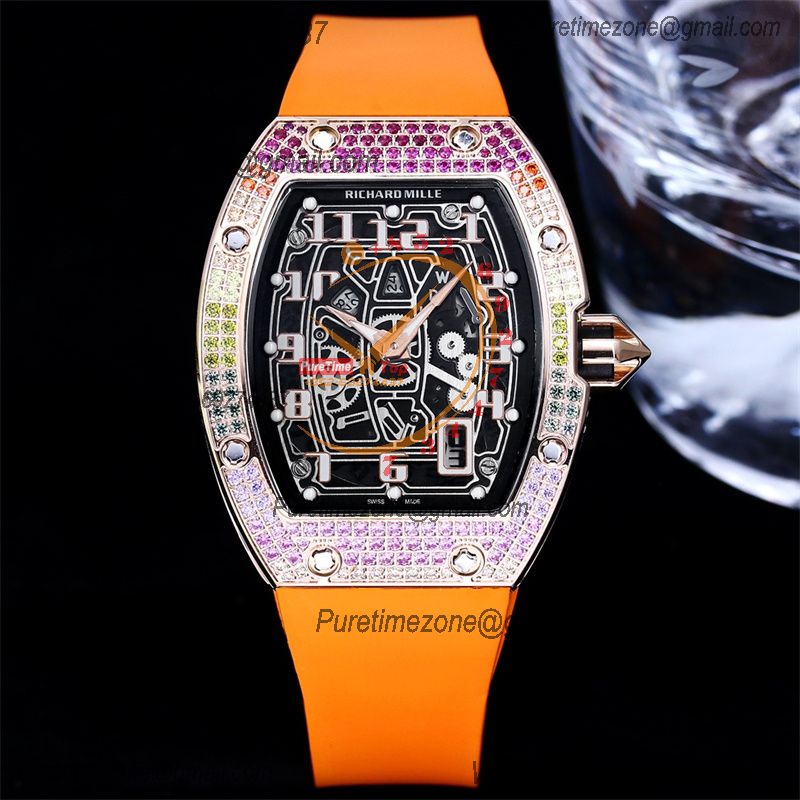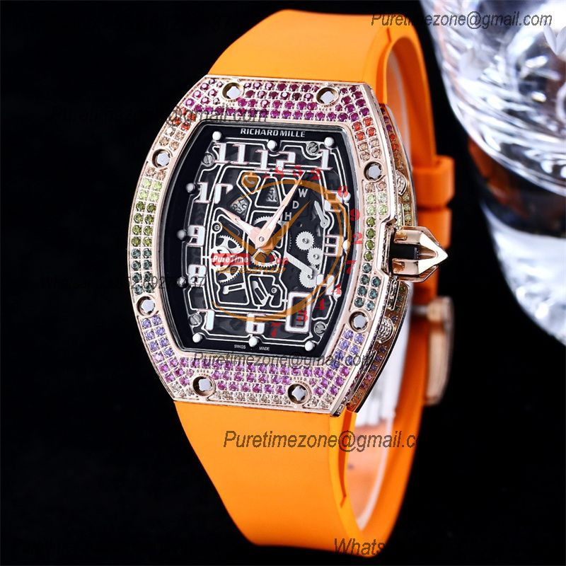 RM67-01 Miyota Automatic Mens Watch RMF RG Rainbow Diamond Bezel Skeleton Dial Orange Rubber CHS